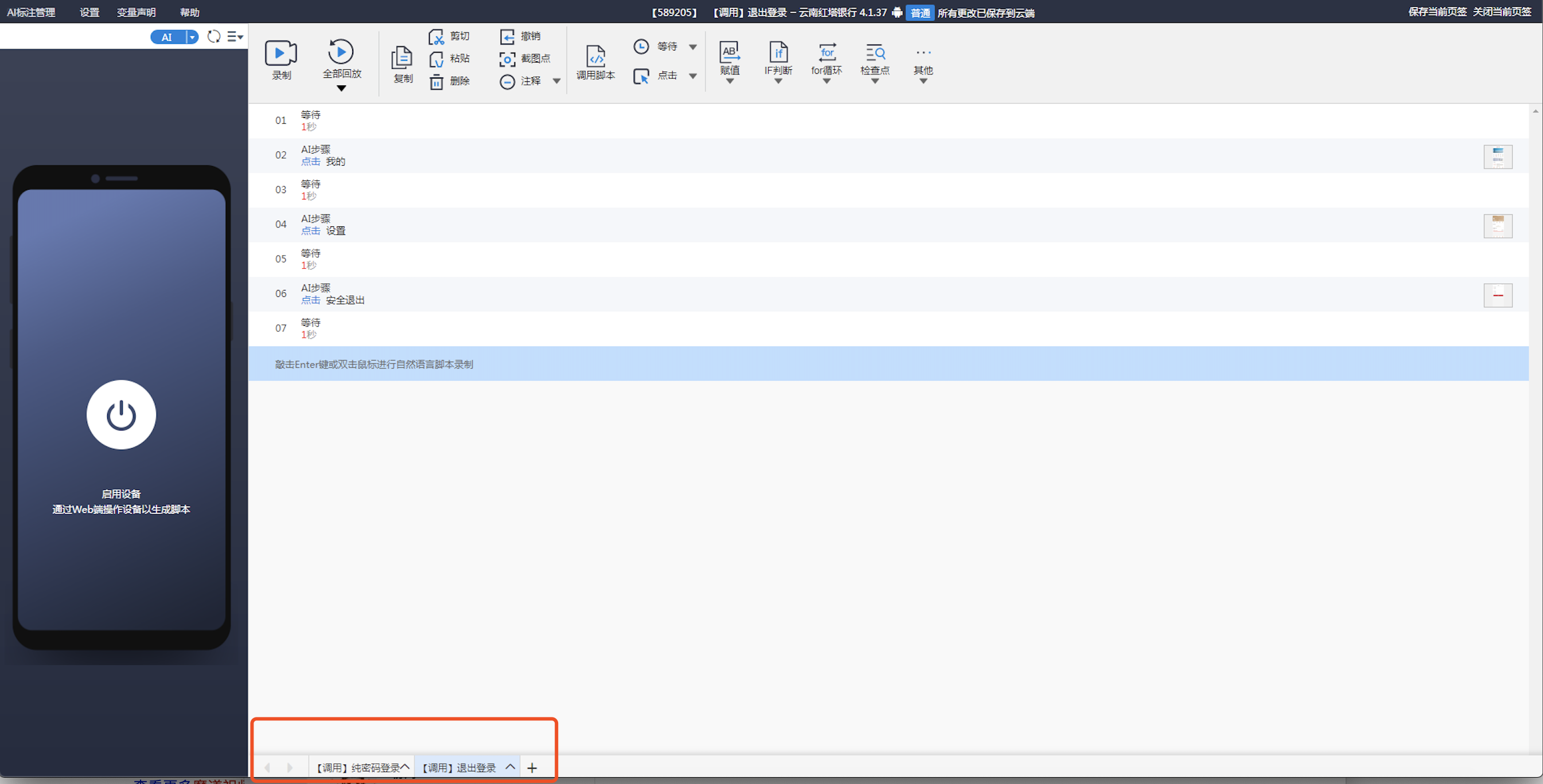 ==注释:5.7.0版本以后回放调用脚本,会打开新的页签展示调用脚本内容,回放完成后,会关闭对应调用脚本页签,如在回放前已打开调用脚本或在回放过程中点击停止回放则不会关闭该调用脚本页签==
