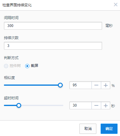 检查界面持续变化:检查当前界面是否持续变化,可设置检查间隔时间,持续次数,判断方式,相似度。