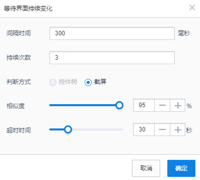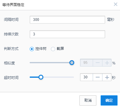 等待界面稳定:等待所有控件都刷新出来后再尝试操作,可以设置间隔时间、持续次数、判断方式、相似度和超时时间。