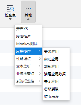 应用操作:录制工具支持在自动化脚本任意一个步骤中对应用的安装&启动&卸载&停止&清除数据进行相应操作,用以适配多应用测试、测试默认应用、应用卸载测试等不同的场景和终端;