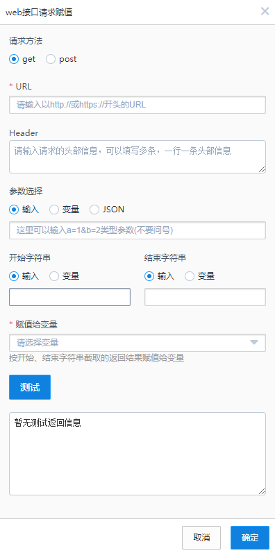 - web接口请求赋值:可以用get/post方法对指定URL进行请求测试。用户可以根据接口地址和参数,得到接口返回信息,即可以自定义截取返回信息,也可赋值给变量,便于执行任务时参数化。支持自定义header。