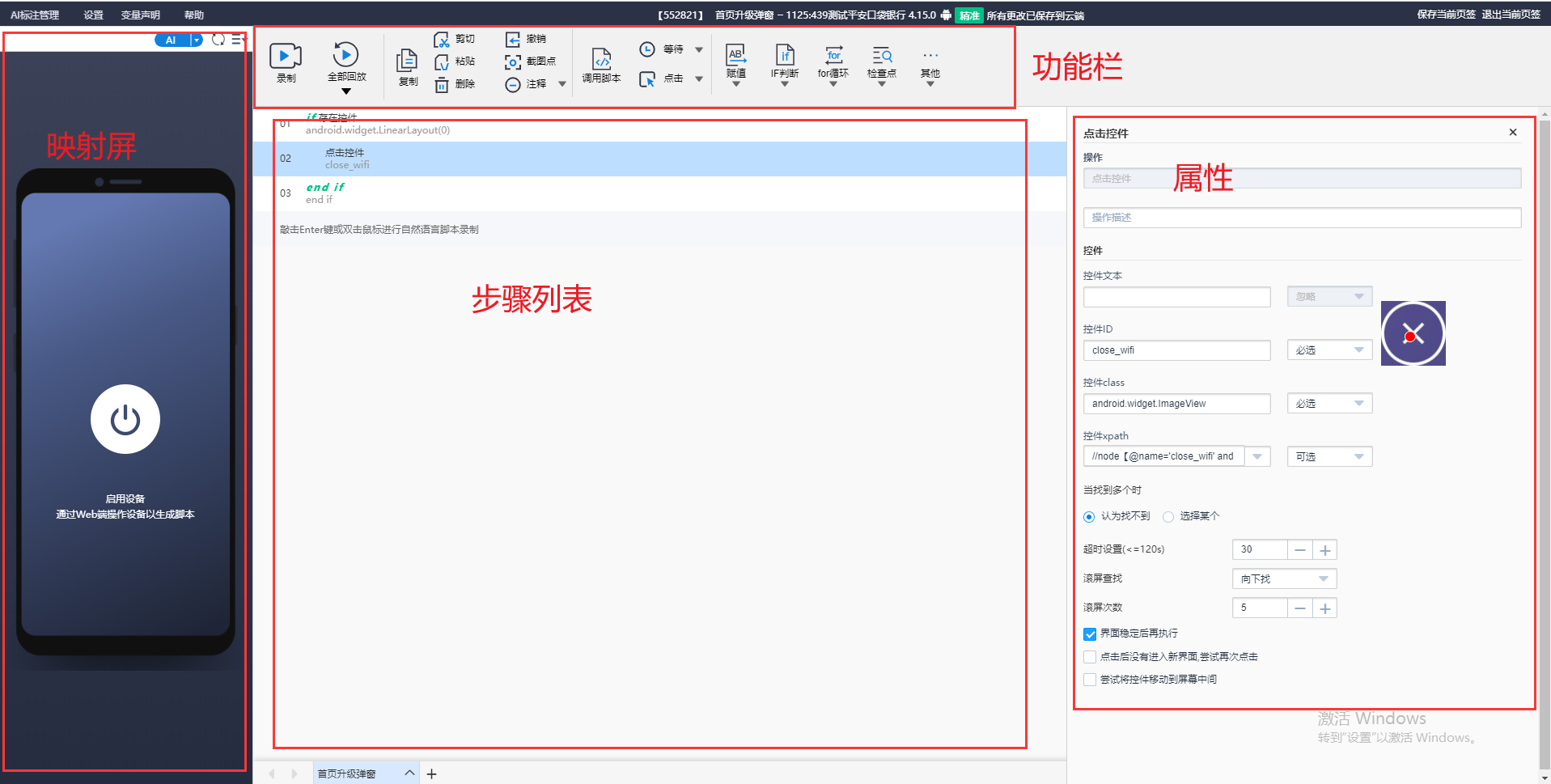 其中工具栏包含脚本基本操作和高级函数,映射屏为手机屏幕显示区域,所有生成的步骤在步骤列表中显示,属性包含了脚本录制中需要用到的组件。