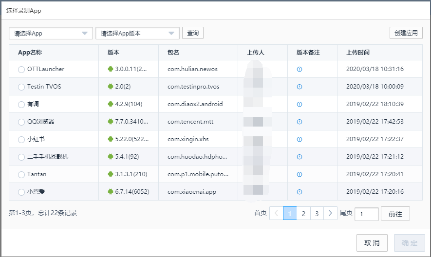 开启录制时需要选择应用,可以通过应用名和版本下拉菜单进行查询,也可以通过创建应用本地上传应用包进行录制。