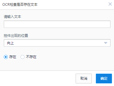 OCRIF是否存在文本:通过OCR识别的方式获取页面控件中的文本与期望文本进行比对,如果存在则执行IF体,如果不存在则跳过IF体执行后续步骤。